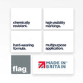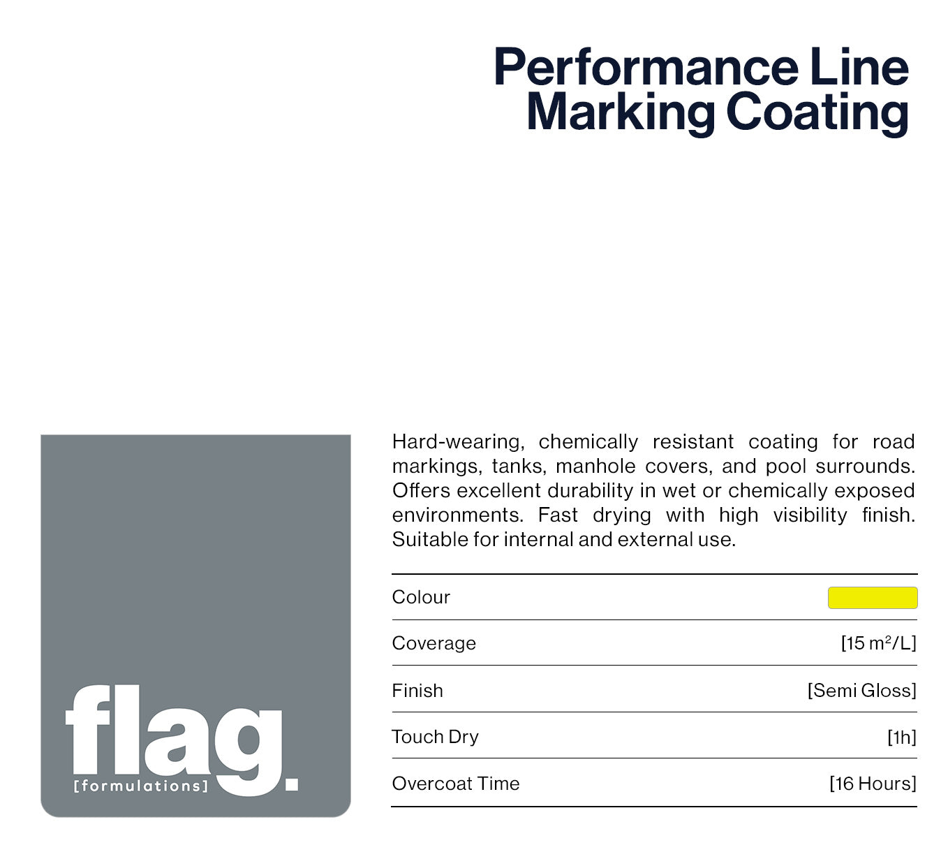 Hard-wearing, chemically resistant coating for road markings, tanks, manhole covers, and pool surrounds. Adheres to concrete and ferrous metal surfaces. Offers excellent durability in wet or chemically exposed environments. Fast drying with a visibility finish. Suitable for internal and external use.